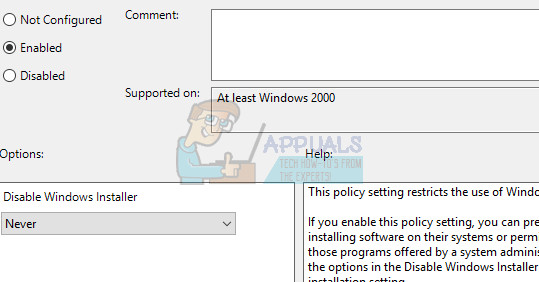 - Double click on the “Turn off Windows Installer” policy option, check the box next to the “Enabled” option, and set the Disable Windows Installer option to Never.