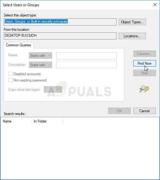 - Under the Group or user names section, try to locate your username on the list. If you fail to do so, click on Add >> Advanced >> Find Now. You should be able to see your user account under the Search results section so select it and click OK twice until you back in the Permissions folder.