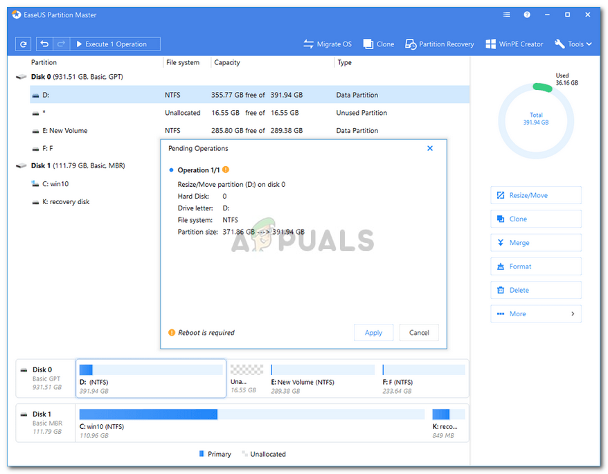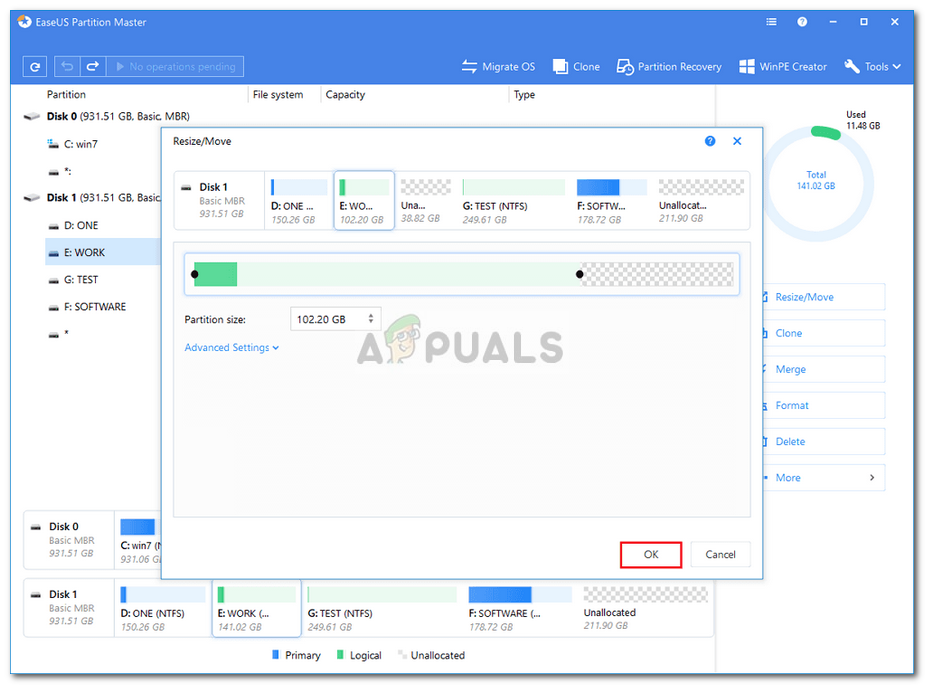 - If needed, shrink a volume: Right-click the partition, select ‘Resize/Move’, adjust size, and click OK.