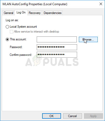 - Follow the steps 1-3 from the instructions above in order to open the service’s properties. Navigate to the Log On tab and click on the Browse… button.