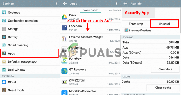 Uninstall the Antivirus in Settings Note: Your “Security App” can be any Antivirus that is installed on your devices, such as Kaspersky Mobile Antivirus, Avast Mobile Security, and ESET Mobile Security.