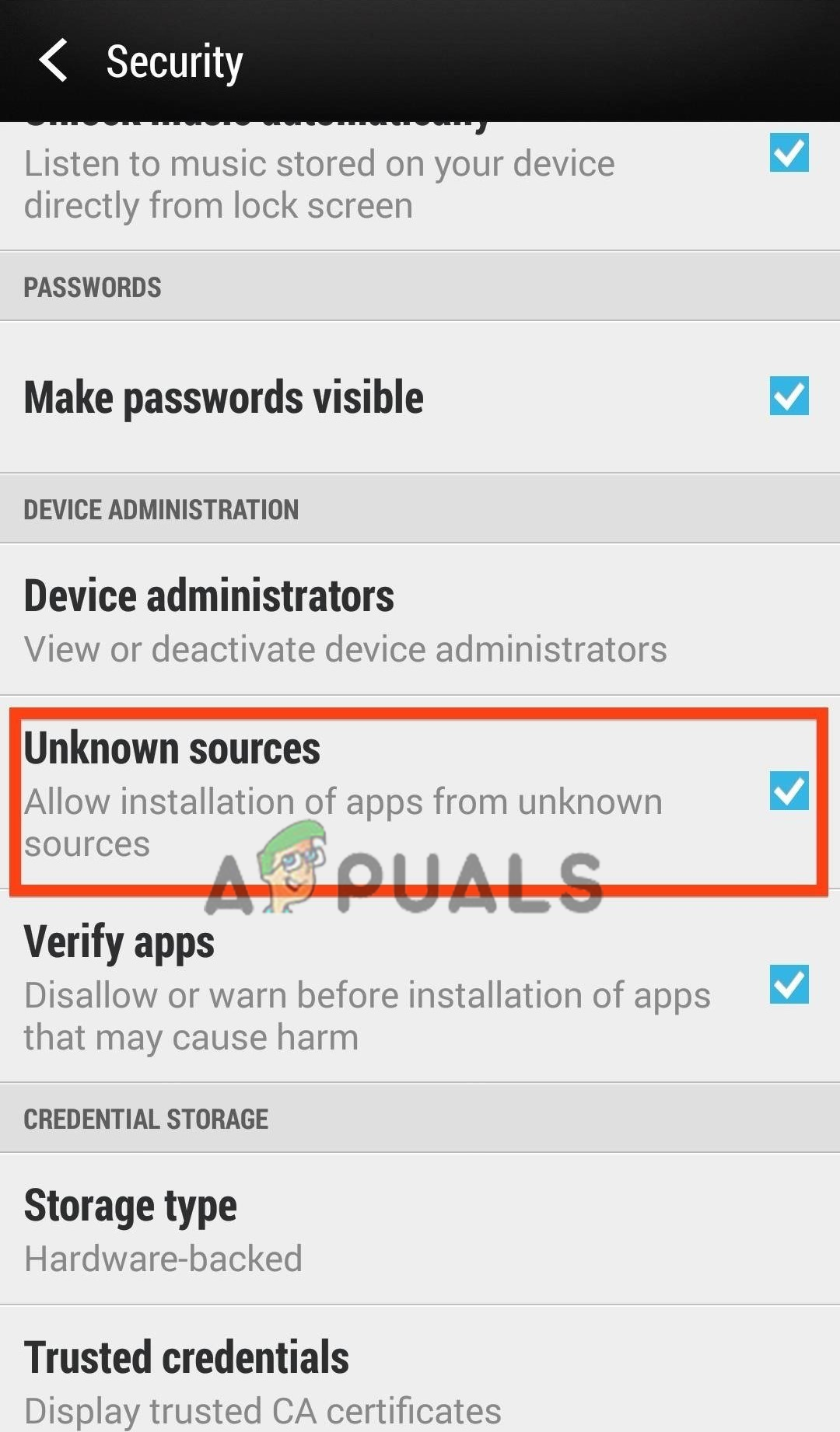 - There you will find the option “Unknown Sources” box, Tap that to enable the permission
