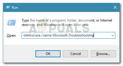 - Press Windows key + R to open up a Run box. Then, type “control.exe /name Microsoft.Troubleshooting” and hit Enter to open the Troubleshooting screen.