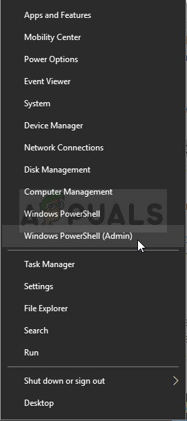 - Open the PowerShell utility by right-clicking the Start menu button and clicking on the Windows PowerShell (Admin) option at the context menu.