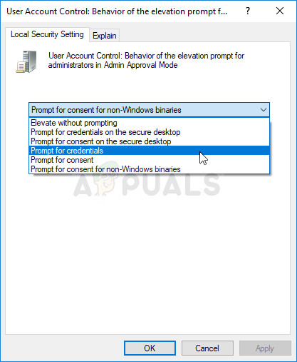 - Double click on the “User Account Control: Admin Approval Mode for the Built-in Administrator account” policy option, check the radio button next to the “Enabled”. Also, double-click the “User Account Control: Behavior of the elevation prompt for administrators in Admin Approval Mode” option, and change it to “Prompt for Credentials.”