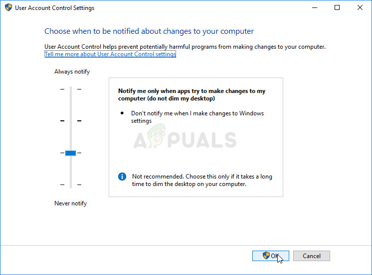 - You will notice that there are several different options you can choose on the slider. If your slider is set at the bottom level, that means that UAC is disabled and that caused the errors to start appearing. Also, there are more errors which are usually caused by User Account Control.