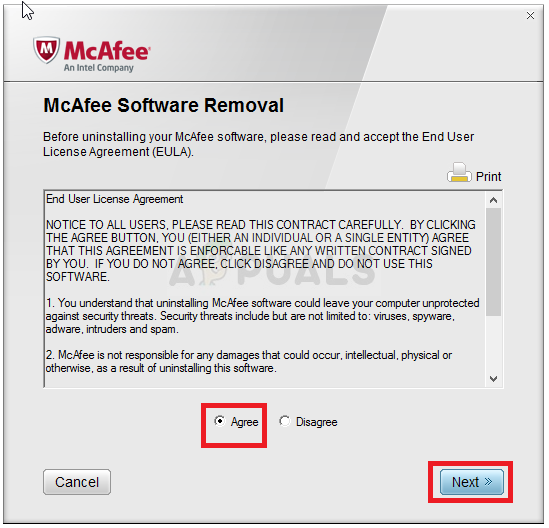 - At the McAfee Software Removal screen, Click Next and click Agree to accept the End User License Agreement (EULA).