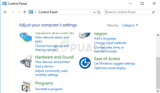 - In Control Panel, select to View as: Category at the top right corner and click on Uninstall a Program under the Programs section.