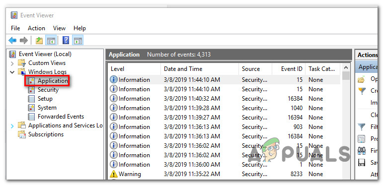 Opening up the Event Viewer utility via a Run command - Inside the Event Viewer utility, use the left-hand side menu to select Windows Logs. Then, double click on Application to bring up the Application events in the right-hand side pane.