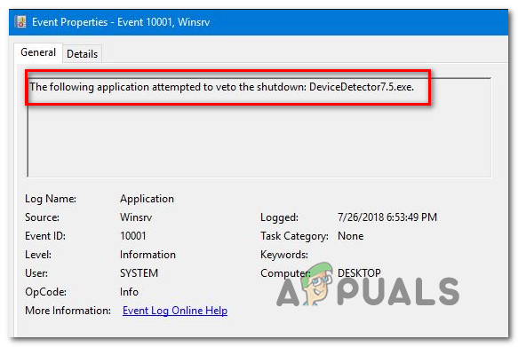 Accessing the Application tab inside Event Viewer - Inside the Application section, look for an event that states “The following application attempted to veto the shutdown” in the General tab (under the list of events). Since you’ve just forced the warning message to appear, it should be one of the very first listings since the default order is by date/time.