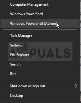 - Open the PowerShell utility by right-clicking the Start menu button and clicking on the Windows PowerShell (Admin) option at the context menu.