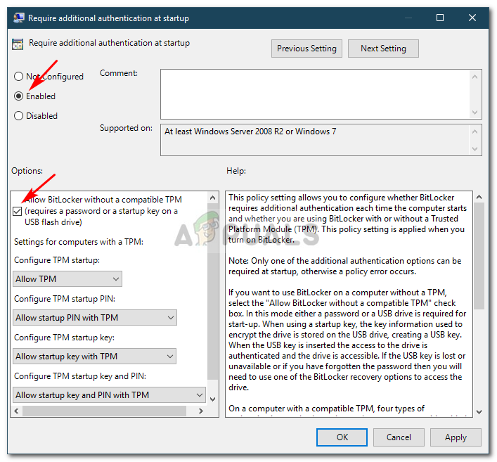 - Afterward, make sure the ‘Allow Bitlocker without a compatible TPM’ box is checked.
