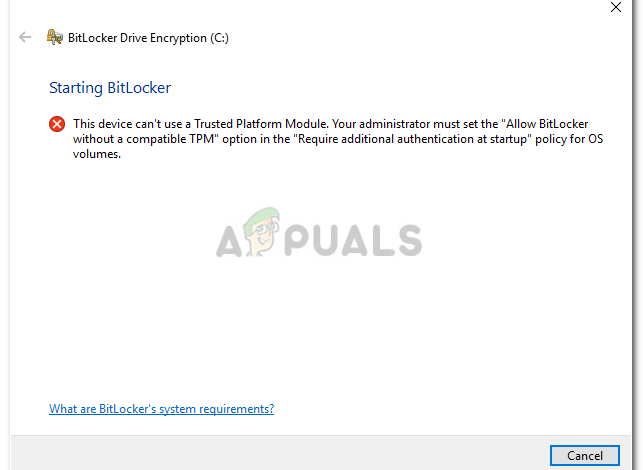 If you receive the error message ‘This device cannot use a Trusted Platform Module’, it can be caused if your computer doesn’t have a TPM chip or due to your group policies. Users have reported that when they try to encrypt a drive on their Windows 10 using the built-in BitLocker, they are prompted with the said error message. The error message contains the fix if looked at closely, however, not everyone has the competency to implement the workaround.