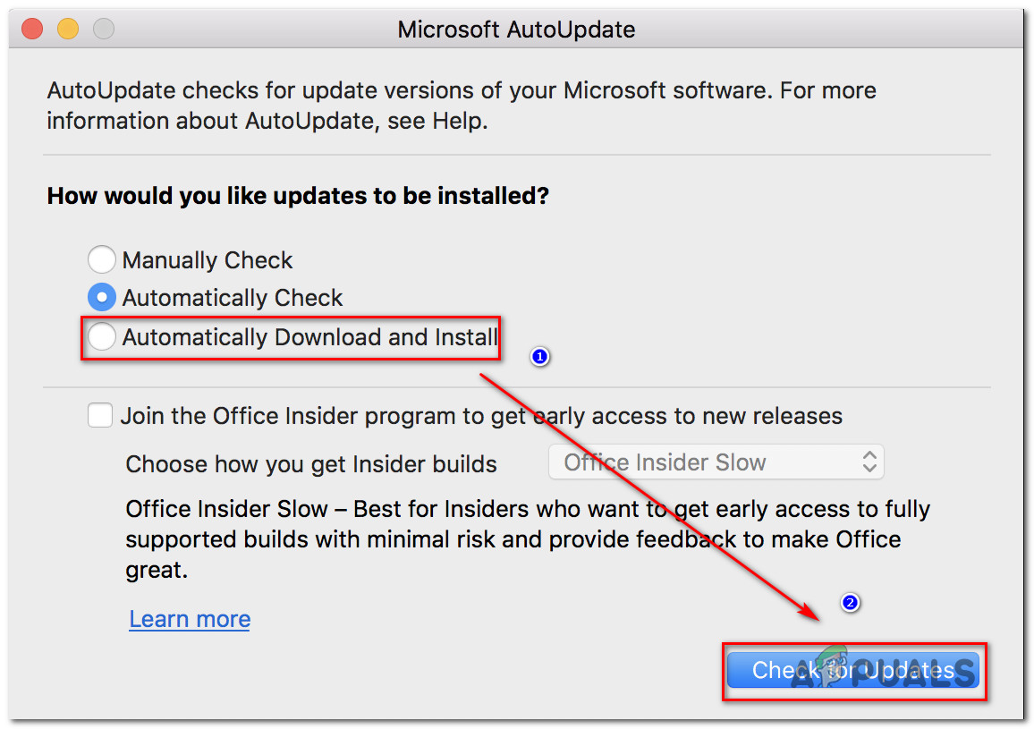 Checking for Updates - From the Microsoft AutoUpdate screen, choose the toggle associated with Automatically Download and install, then click on Check for updates.