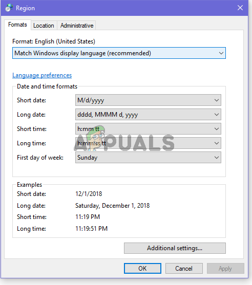 - In the Region dialog, under the Formats tab, set the format to English (United States).