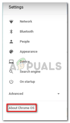 Accessing the Settings menu on a Chromebook - Expand the Settings menu from the left section of the screen and click on About Chrome OS.