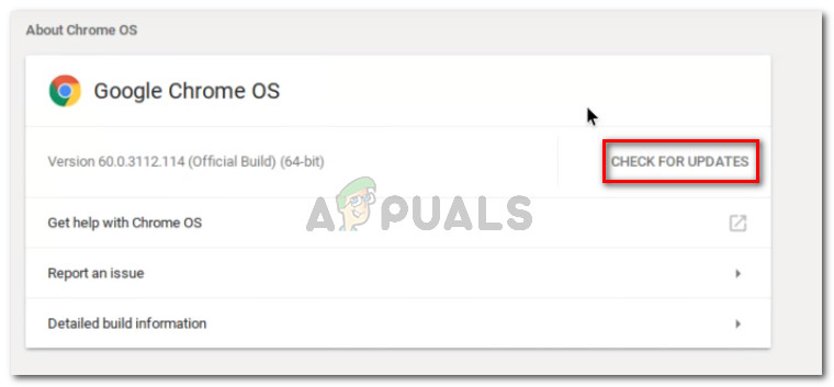 Accessing the About Chrome OS menu - Under Google Chrome OS, click Check for Updates to trigger a scan. If a new software update is found available, the download will start automatically.