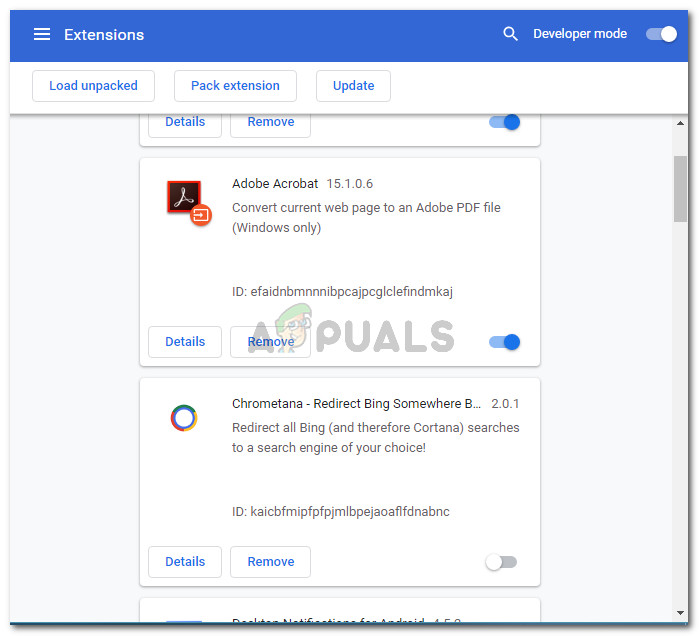 Re-enabling each extension systematically - You’ll eventually come across the extension that is triggering the error. Upon reloading the URL, you’ll notice that the error has returned. When you see this occurring, return to the Extension menu and target the last extension that you enabled. Then, click the Remove button and confirm to delete the troublesome extension for good.