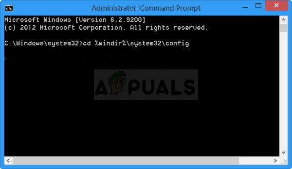 - Navigate to the following folder in the Command Prompt “C:\Windows\System32\config” by using the command displayed below. Make sure you click Enter after each one.
