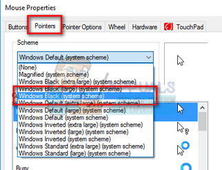 - Click the tab of “Pointers” and select another pointer. After making the changes press “Apply” and restart your computer. Now check if the problem is solved.
