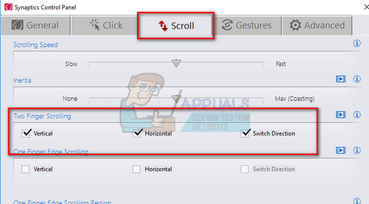 - Open the tab “Scroll” and make sure all the entries in the two-finger scrolling are enabled. If they were disabled, enable them and restart your computer for the changes to be implemented.