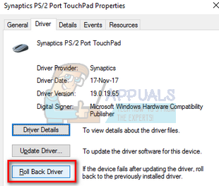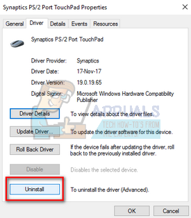 - Open the tab of “Driver” and click on “Uninstall” present at the near end of the screen. Do this for all the touchpad/mouse drivers.