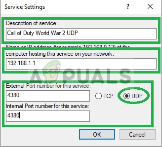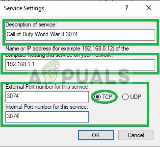 - In both External Port and Internal Port, write each TCP number that was included in the list (for example, for PC you will first write “3074” in both the “External Port for this service” and “Internal Port for this Service” option and press “OK” then repeat the process for “27015-27030, 27036-27037” numbers).