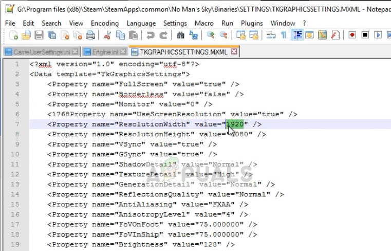 - Now once you have opened the configuration file, search for the tag ‘ResolutionWidth’ and ‘ResolutionHeight’. Check if the current resolution is set. If the values don’t match, you should change the value to what you saw earlier on.