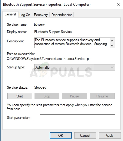 - Make sure that the option under the Startup type menu in the service’s properties window is set to Automatic before you proceed with other steps. Confirm any dialogue boxes which may appear when changing the startup type. Click on the Start button at the middle of the window before exiting. Make sure you repeat the same process for all Bluetooth services.