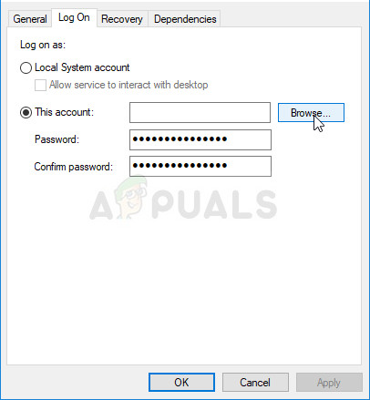 - Follow the steps 1-3 from the instructions above in order to open the service’s properties window. Navigate to the Log On tab and click on the Browse… button.