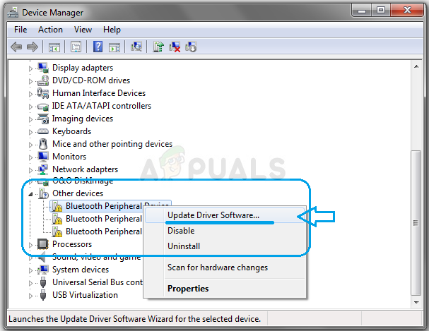 - Expand the either the Other devices section at the very bottom of the Device Manager window or the special Bluetooth section. If there is a Bluetooth section, right-click on all entries underneath this section and choose the Update Driver option from the context menu.