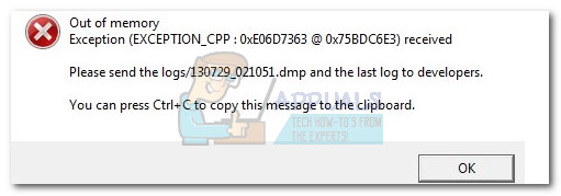 The 0xe06d7363 error is also known to appear when the application is trying to use old libraries that are not installed on the user’s computer. This will typically produce the 0xe06d7363 error along with a message like “Out of Memory” or “Memory Error“.