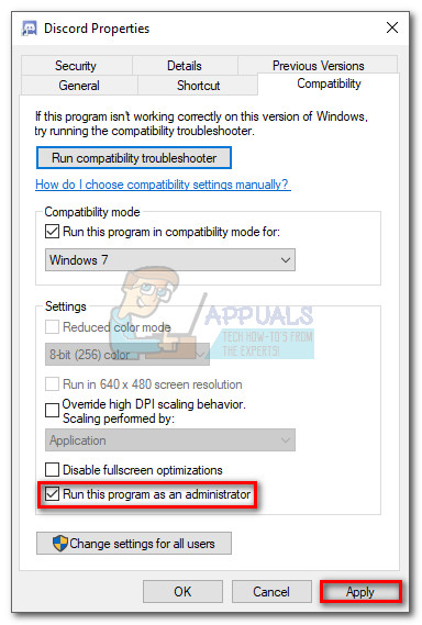 Note: Running the program in compatibility mode for Windows 7 has the highest probability of solving a compatibility issue if the error message is a cause of that. - Move below to Settings and check the box next to Run this program as an administrator. Hit Apply to save your modifications.
