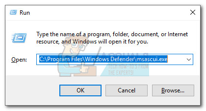 - Press Windows key + R to open a run command and type “C:\Program Files\Windows Defender\msascui.exe”. Hit Enter to open Windows Defender.