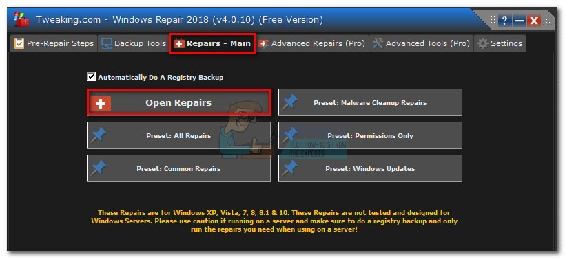 - Go to the Repairs – Main and check the box next to Automatically Do A Registry Backup. Then, click on Open Repairs and wait for the repair wizard to start.