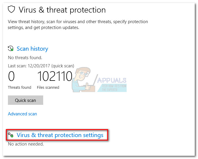 - In the Windows Defender Security Center window, click on Virus treat & protection, then scroll down and click on Virus & Treat protection settings.