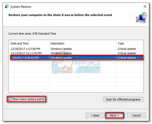 - Hit Next in the first window and then check the box next to Show more restore points. Select a restore point prior to when the application started malfunctioning and click the Next button.