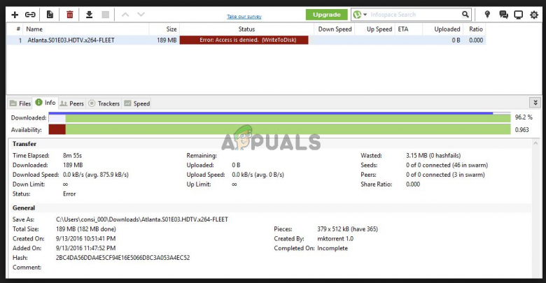 A lot of users on the uTorrent forums reported that most versions after the update 3.4.2, give a vague error when trying to download a torrent. The error says that access to disk has been denied and that the torrent can’t be downloaded. The error could occur while a torrent is in progress.
