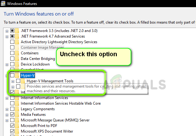 Now if Hyper-V is installed on your computer, we will disable it and restart your computer. This will remove the conflict between Hyper-V and VirtualBox and fix the issue.
