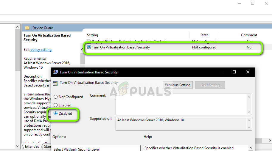 - Now double-click the policy Turn on Virtualization Based Security and set it as Disabled.