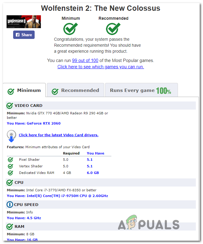 - After the scan is finished, return to the Can You Run It page and take a look at the results. If you see a green checkmark under Minimum, your rig is strong enough to run the game (so the error appears due to a different cause).