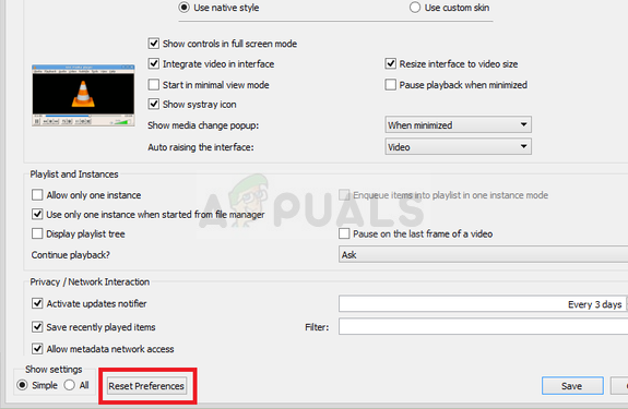 Resetting the preferences is quite an easy way to resolve the problem and several users have reported that this worked for them in their scenario. Bear in mind that you all VLC settings you have changed will be reset and you will have to redo the changes you have made since installing the program. Follow the steps below!