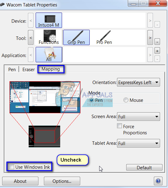 - Select the tab ‘Mapping’ and make sure the option “Use Windows Ink” is unchecked. Save changes and exit.