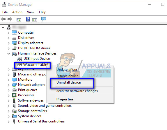 - Navigate through all the devices until you find the category “Human Interface Devices”. Expand it and select “Wacom Tablet”. Right-click it and select “Uninstall Device”.