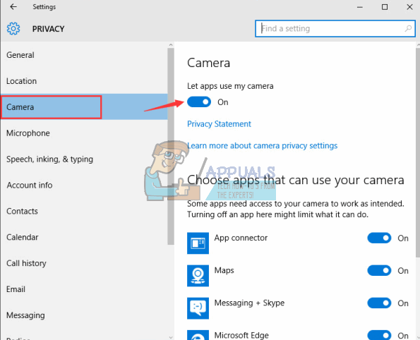 - Locate the Let apps use my camera option and make sure that it is enabled, meaning that apps on your computer are allowed to access and use the camera.