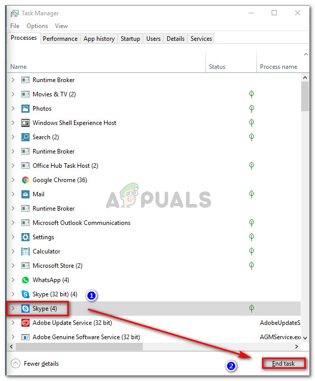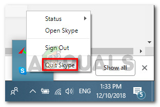 Quitting Skype - Press Ctrl + Shift + Esc to open Task Manager. Inside Task Manager, go to the Processes tab and kill every process related to Skype by selecting it and choosing End Task.