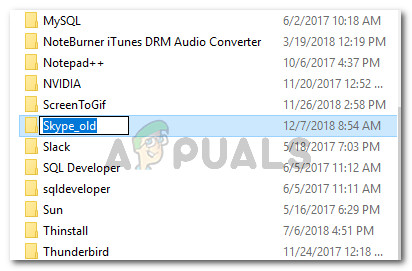 Running dialog: %appdata% - In the opened folder, locate the Skype folder. Once you see it, right-click on it, choose Rename and change its name to something different (e.g. Skype_old).