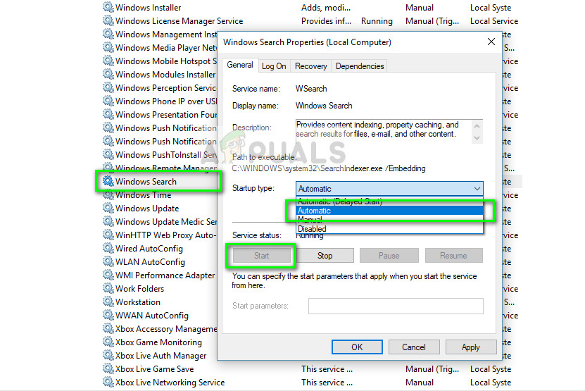 - Once in the properties, start the service and make sure that the startup type is set as Automatic.