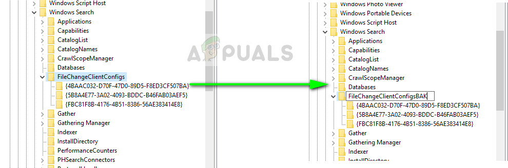 Computer\HKEY_LOCAL_MACHINE\SOFTWARE\Microsoft\Windows Search\FileChangeClientConfigsBAK