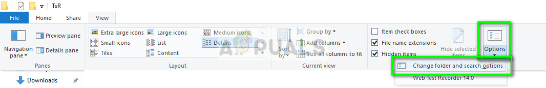 - Once in the directory, click on View > Options > Change folder and search options.